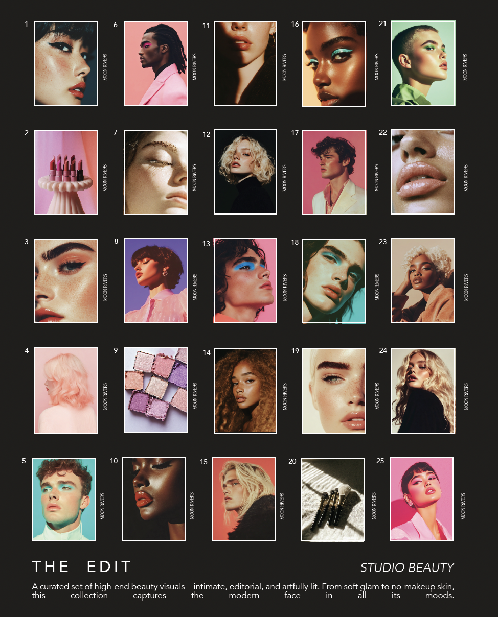 A bold, editorial-forward collection of modern beauty visuals. From dewy skin to electric shadow, soft glam to sculptural detail, this edit captures beauty in all its forms—sensual, experimental, and striking. Designed to help brands tell visual stories that feel fresh, iconic, and full of presence.