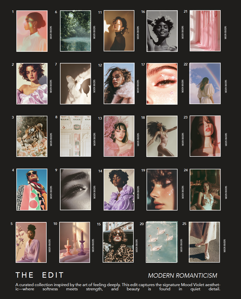 A curated collection inspired by the art of feeling deeply. This edit captures the signature Mood Violet aesthetic—where softness meets strength, and beauty is found in quiet detail. From poetic portraits to painterly compositions, these images are made for heartfelt storytelling and aesthetic-led design.