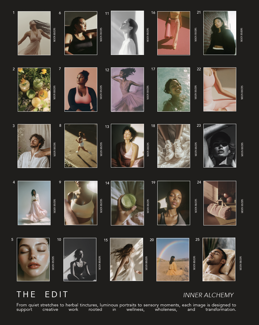 From quiet stretches to herbal tinctures, luminous portraits to sensory moments, each image is designed to support creative work rooted in wellness, wholeness, and transformation. Grounded and luminous.